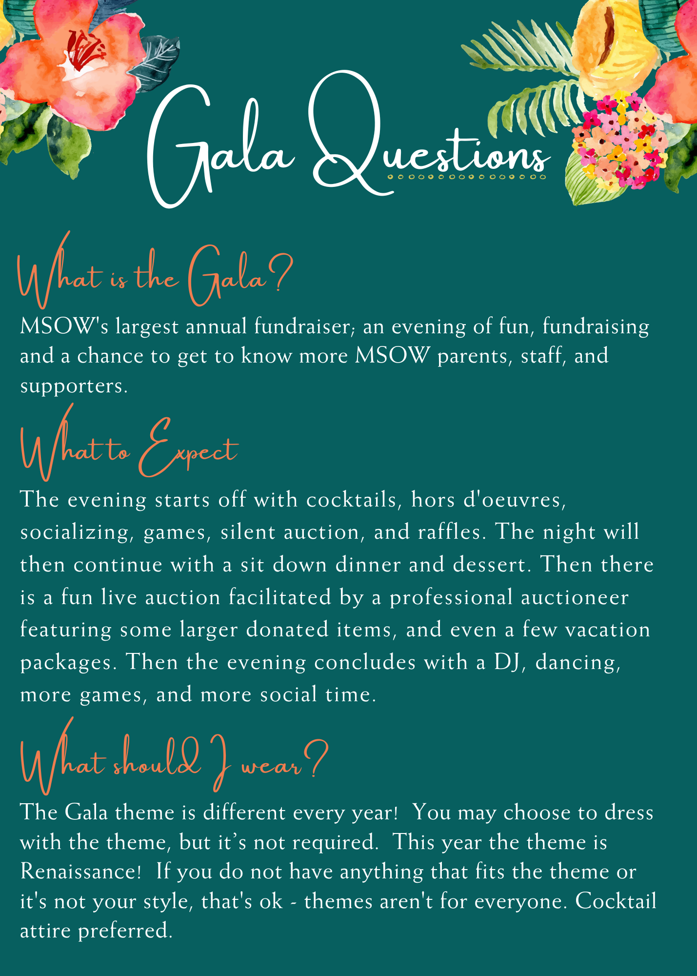 We are delighted to invite you to our annual fundraiser Gala, Polynesian Paradise! This page will be your go-to source for all event details, including sponsorship and donation information, a link to RSVP electronically, our Gala FAQ page, and hotel room block details. We can't wait to celebrate with you at this magnificent event, and we are deeply grateful for your ongoing support of MSOW!
